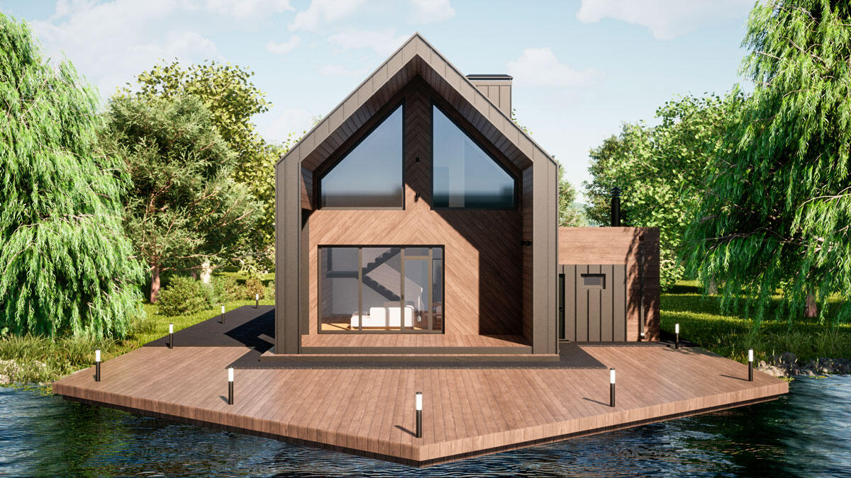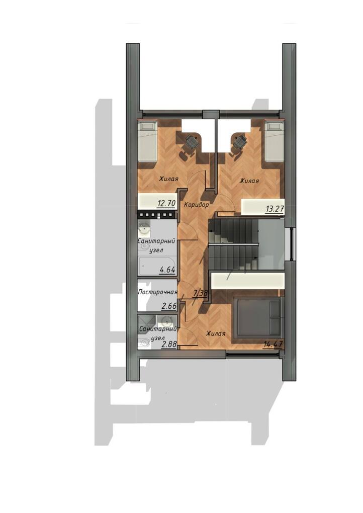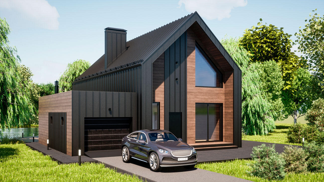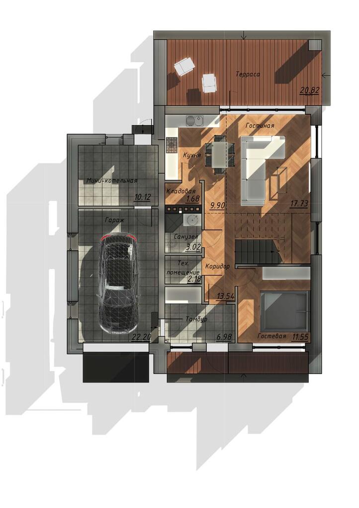 Гараж примыкает к дому, по соседству расположена мини котельная. Все жизнеобеспечивающие системы находятся вне жилой зоны. На первом этаже гостевая комната всегда доступна для компании друзей. Большая кухня и гостиная разместит всех желающих совместить приготовление пищи с общением. Просторный коридор после тамбура примыкает к широкой лестнице, ступени которой ведут на мансардный этаж.