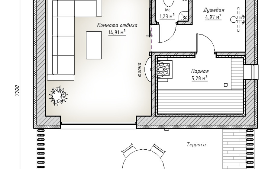 Нашими специалистами был разработан проект небольшой стильной бани. Несмотря на компактные размеры ,баня органично обьединяет в себе все необходимые зоны для полноценного отдыха, делая ее идеальным решением для загородного дома.