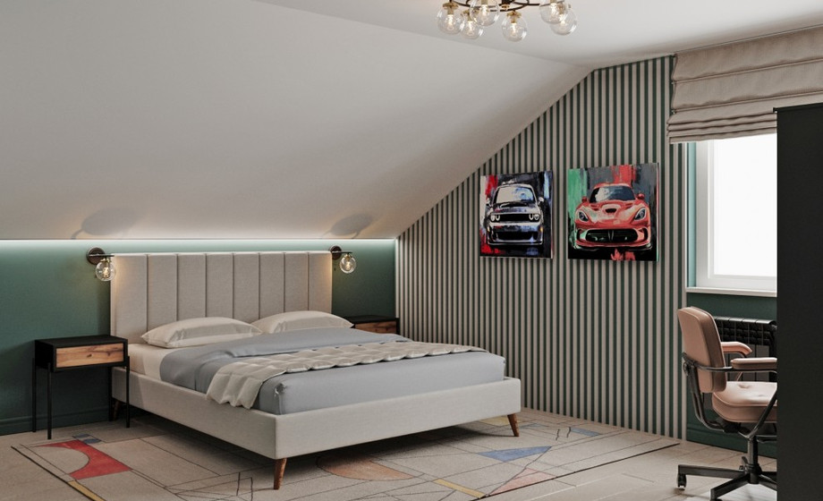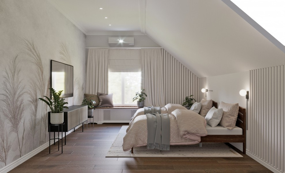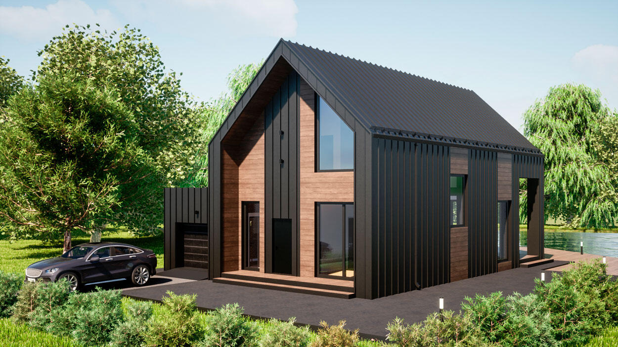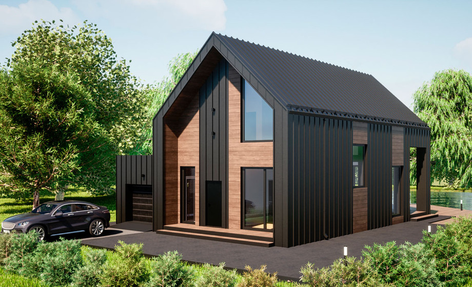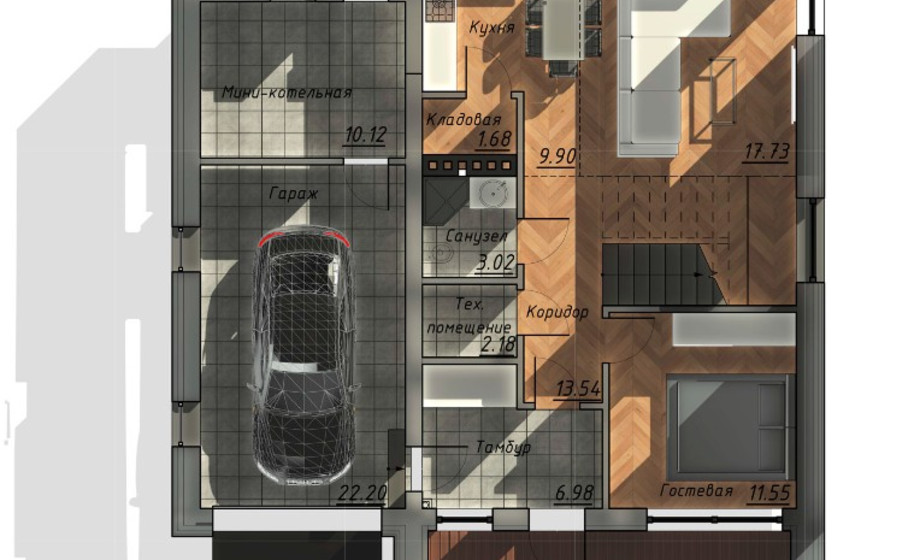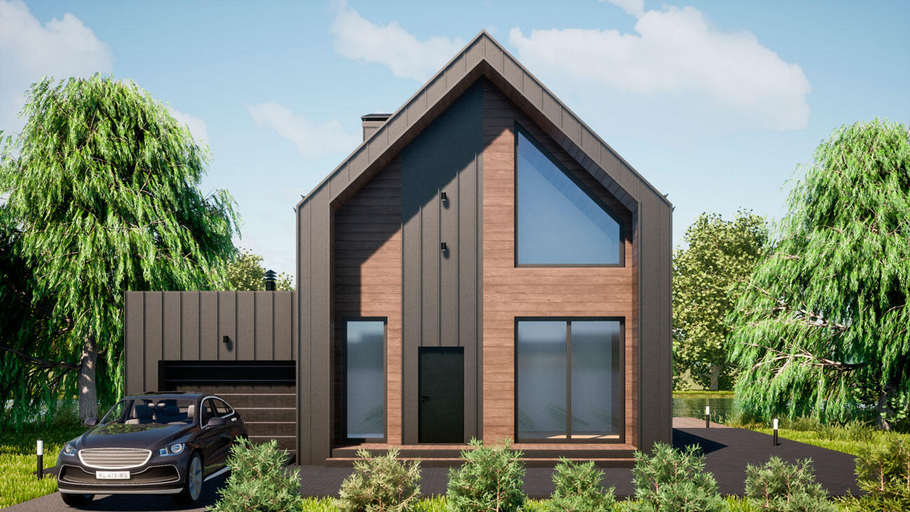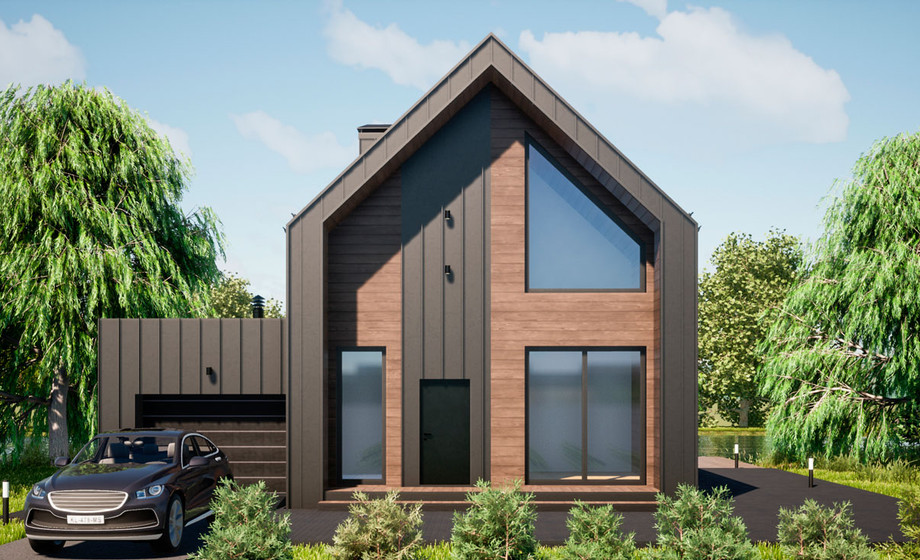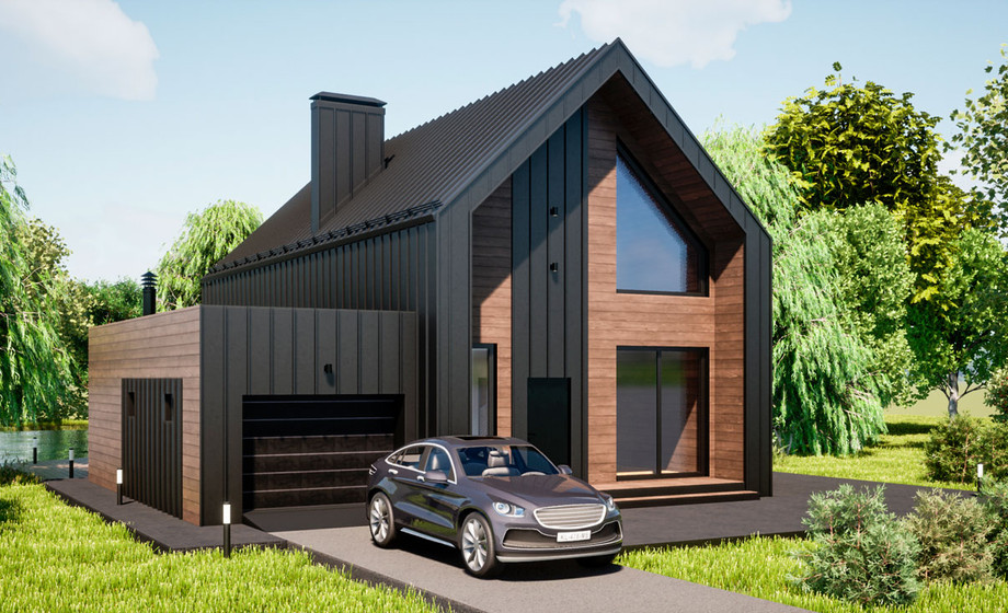 Гараж примыкает к дому, по соседству расположена мини котельная. Все жизнеобеспечивающие системы находятся вне жилой зоны. На первом этаже гостевая комната всегда доступна для компании друзей. Большая кухня и гостиная разместит всех желающих совместить приготовление пищи с общением. Просторный коридор после тамбура примыкает к широкой лестнице, ступени которой ведут на мансардный этаж.