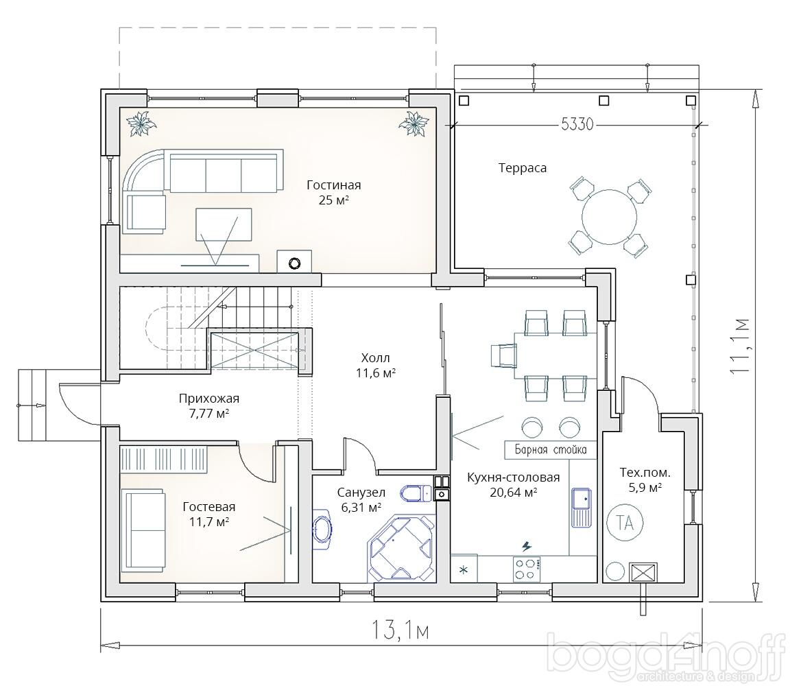 - С ОТДЕЛКОЙ .Т-65 Жилой коттедж 13.1 * 11.1 метров
