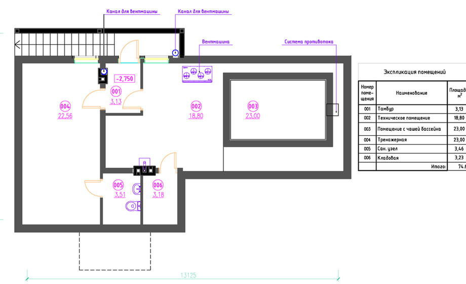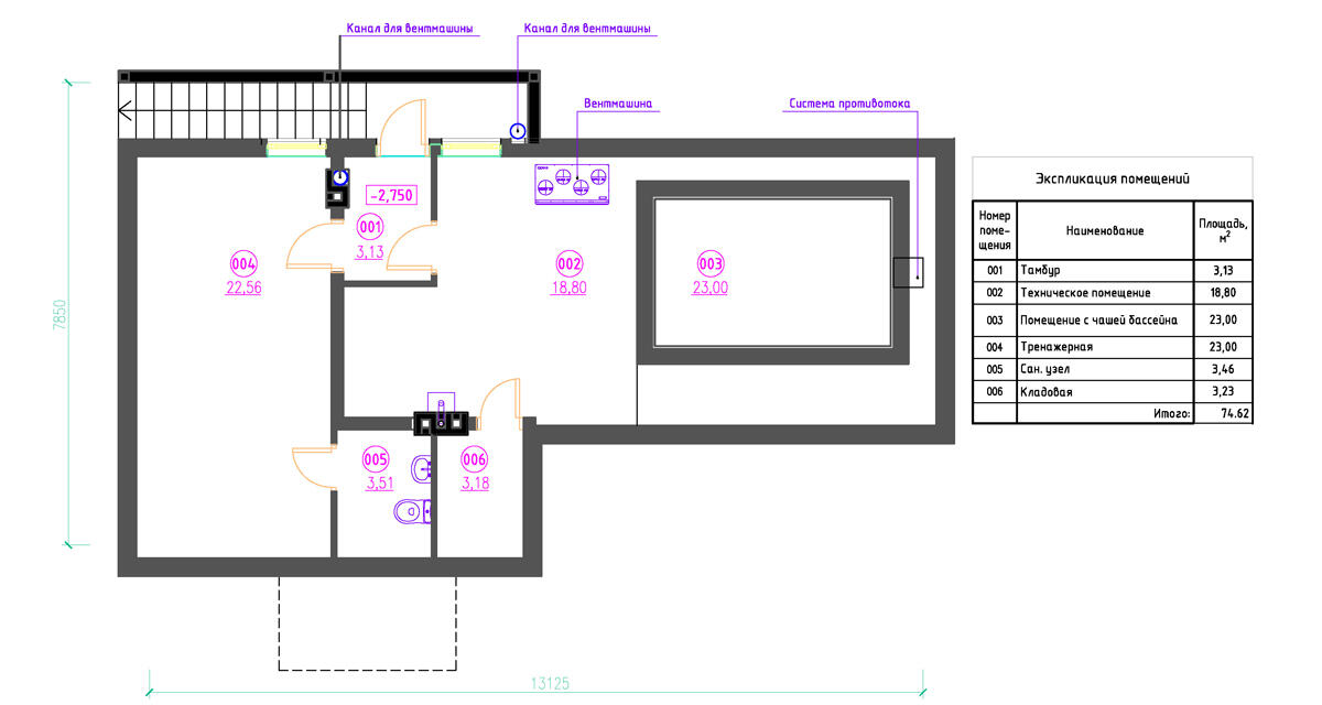 Новинкой нашего проекта является цокольный этаж. Вернувшись на улицу и обойдя постройку, обнаруживаем приямок с лестницей под массивным деревянным навесом. Лестница ведет в цокольный этаж. Здесь находятся железобетонная чаша бассейна и обслуживающее его оборудование, отдельное техническое помещение, в котором можно расположить тренажерный зал, бильярдную, погреб для хранения разных продуктов питания, а также санузел и кладовая.